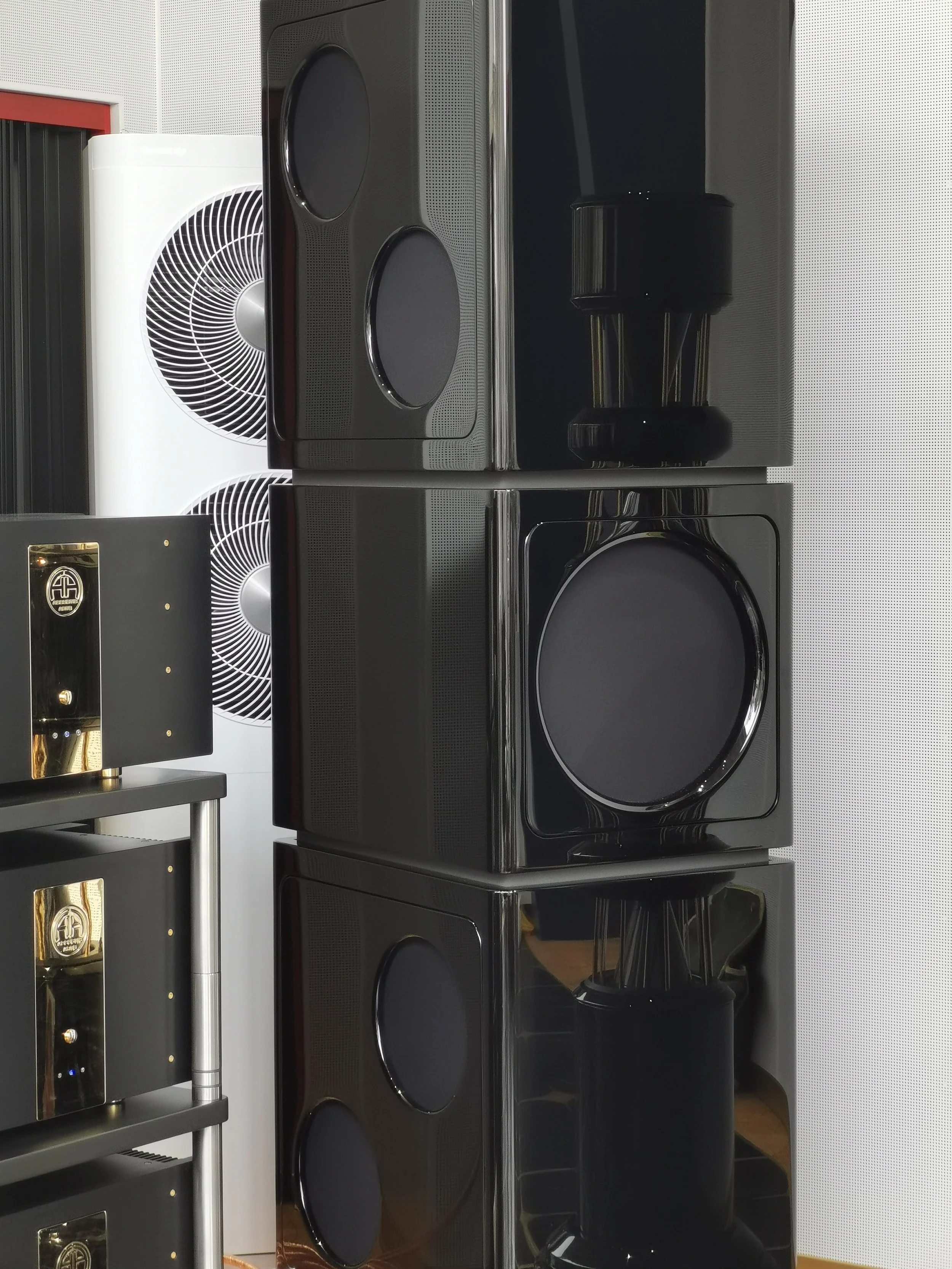 The trim panels around the woofer and subwoofer drivers are finished in black or white high polish polyester as standard. They may also be ordered finished in custom colour high-polish polyester, high-polish veneer, carbon fibre or leather. They are held in position by neodymium magnets which are embedded within the cabinet and which are invisible when the trim panels are in position. This arrangement allows the trim panels to be quickly and easily changed. A customer may purchase more than one set of trim panels and then change the panels when they wish.