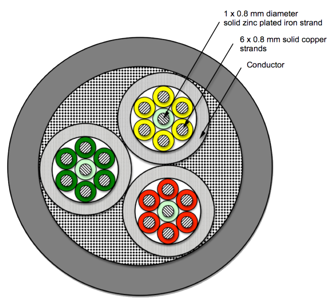 To maximise this, the 6 copper strands are very tightly wrapped around the iron core to form the conductor and the 3 conductors are then very tightly twisted within the cable as can be seen above.